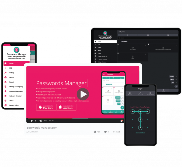 Explore everything Passwords Manager offers for secure secret management: 20+ interface languages (more on request), categories, import and export, fingerprint/biometric, pattern, or password unlock on every tier, AES-256 encryption, password hygiene tools, bookmarks, reminders, idle lock, screenshot blocking, and a built-in password generator. PM Max adds password autofill and encrypted cloud sync to providers you choose (see below). Your data is not stored on our servers, so we cannot recover it for you (see "No company servers" below).